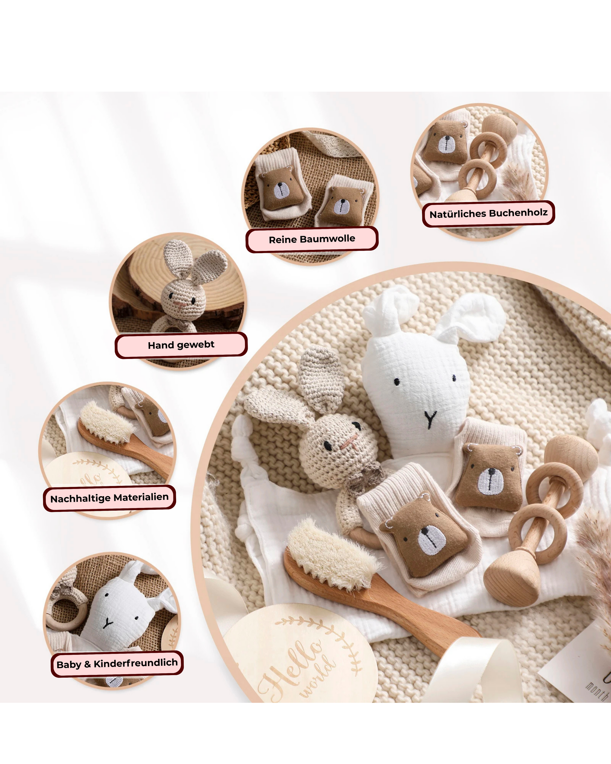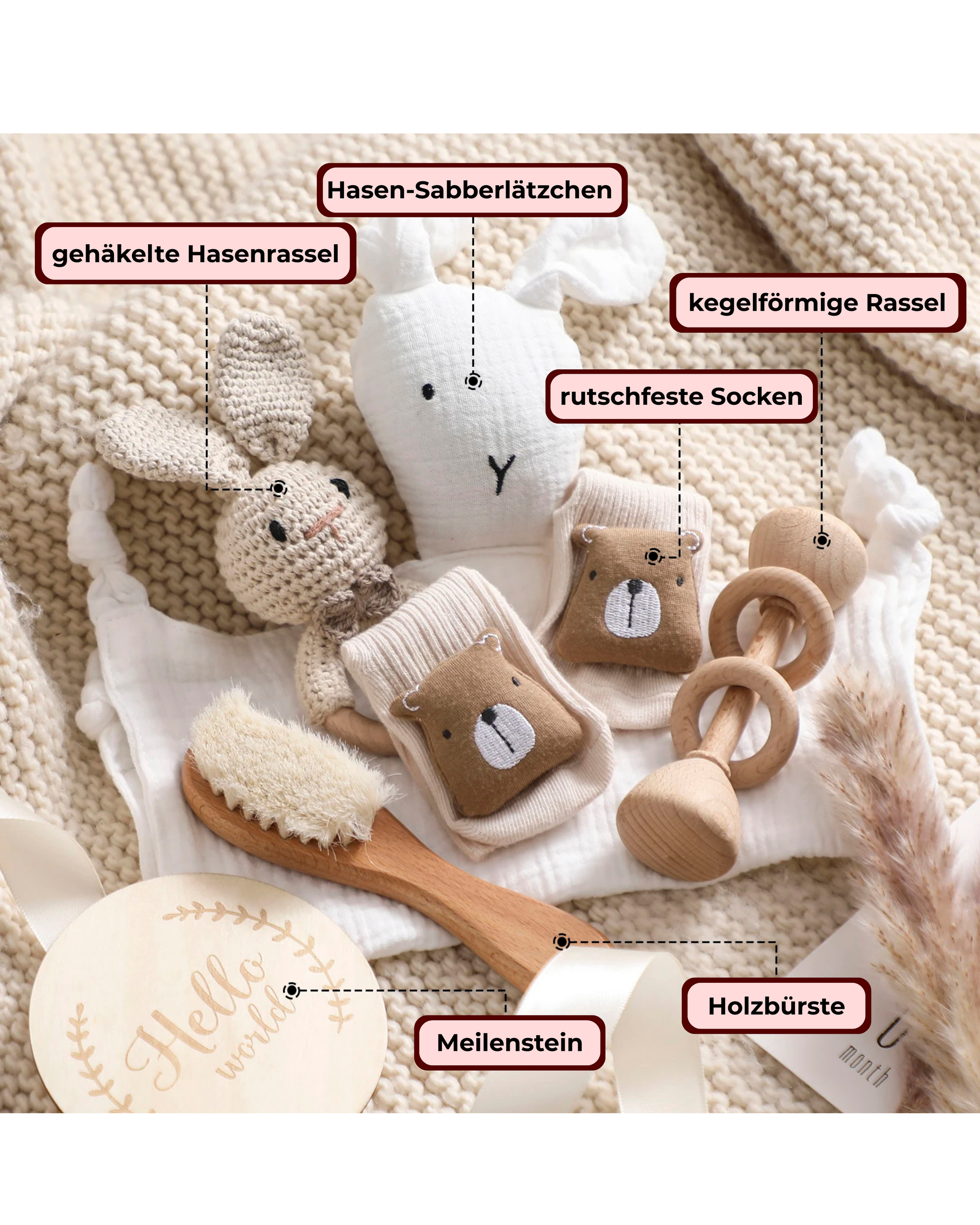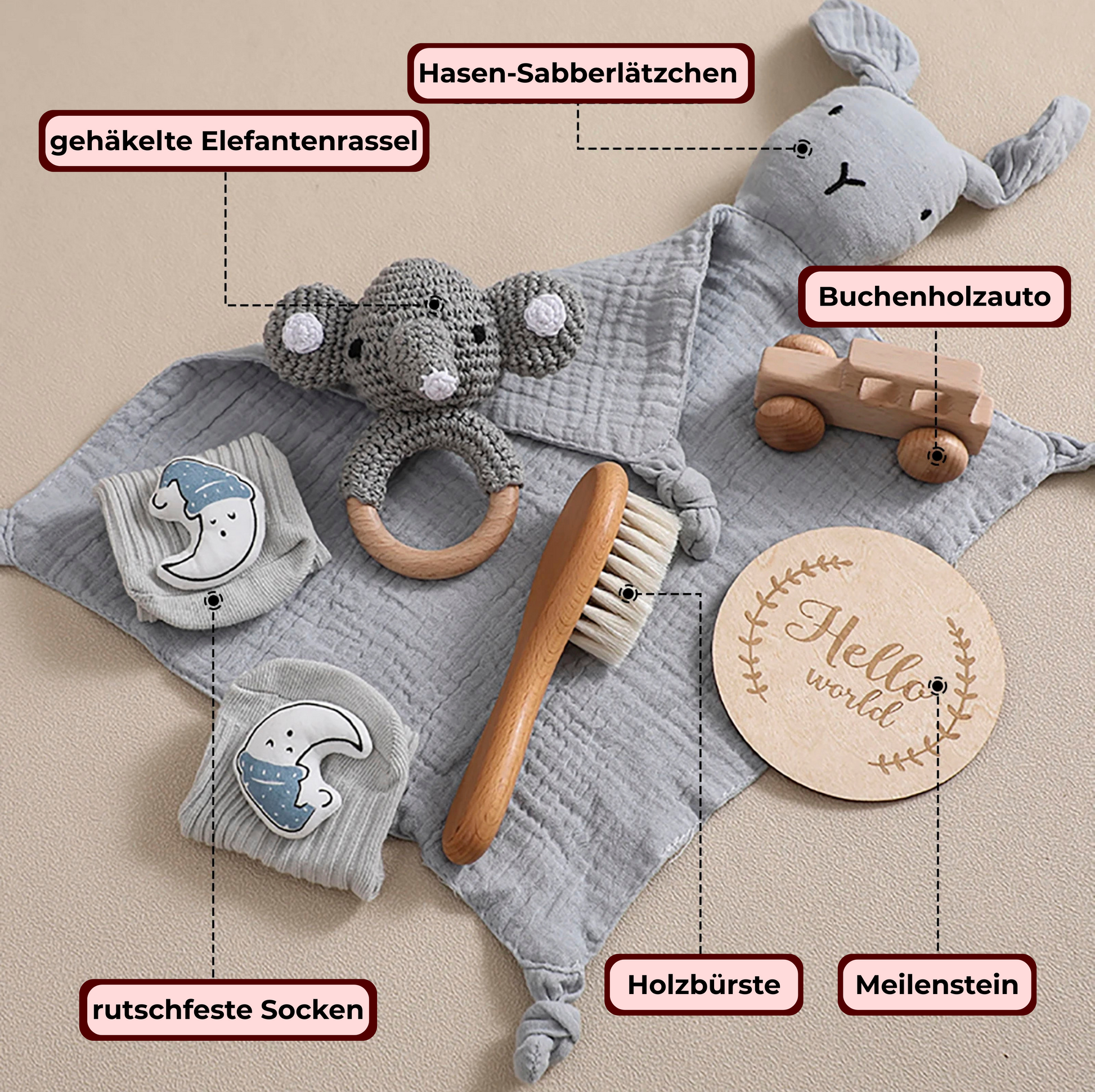 Diese Baby Geschenkbox enthält echte Essentials wie Musselin-Tuch, Holz-Beißspielzeug, Meilensteinkarten und Montessori-Holzspielzeug – Dinge, die Eltern wirklich nutzen und lieben.